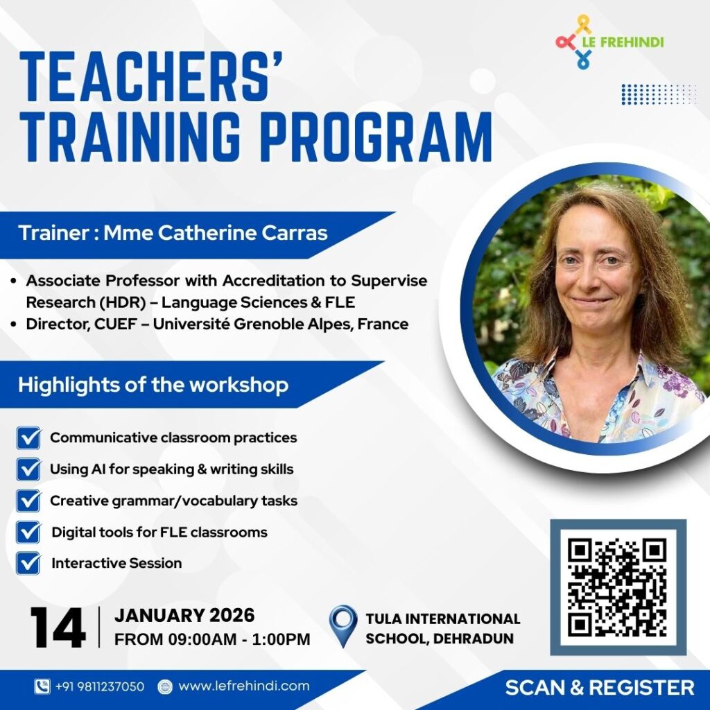 Le Frehindi is pleased to announce a special teacher training workshop led by renowned French language expert Catherine Carras on Wednesday, 14 January 2026, in Dehradun. This exclusive professional development program will be hosted at Tula’s International School, Dehradun, and will bring together French language educators from across India for an enriching and practice-oriented learning experience.